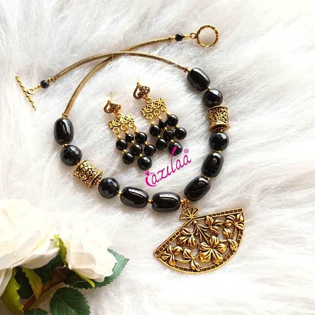 Statement antique golden black onyx gemstone beaded necklace set. Banded shaded black gemstone beaded necklace earrings set. Handmade with Lots of Love. One of a kind gemstone Jewellery, Enjoy!!