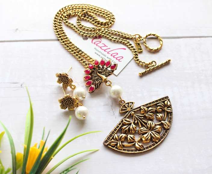 Floral pendant Swarovski crystal pearl chain necklace earrings. Trendy & floral white pearl necklace set. Handmade with love. Enjoy!
